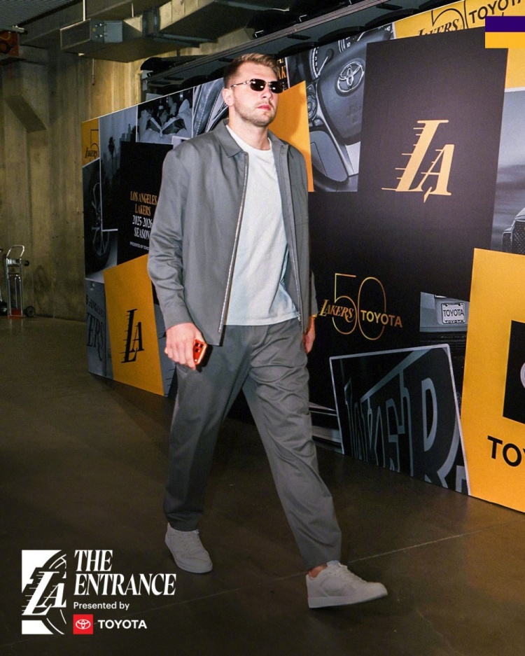 湖人入场照:东契奇简约穿搭+墨镜 里夫斯灰色卫衣印着“中国”